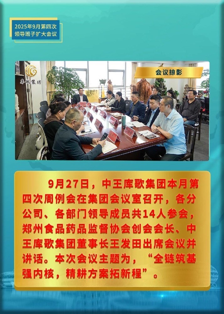 10月25日,中王库歌集团本月第四次领导班子扩大会议在集团会议室召开,各分公司、各部门领导成员共18人参会,郑州食品药品监督协会创会会···[详情]